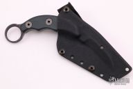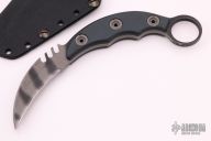 The HS Karambit is a collaboration design with Steve Tarani. Has a tiger striped double-edged hawkbill blade, .189" blade thickness and 1.011" blade depth. Sharpened top edge. Has green G-10 scales. There are light sheath marks on the blade, otherwise excellent condition. Comes with kydex sheath.