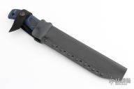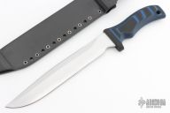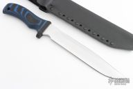 This SpellBinder by MadDog Knives features a double edged blade with .250" stock. 1.407" blade depth. Selectively tempered, the knife has a Rockwell C-scale hardness of 62 at the edge (as hard as a file), and HRC 50-54 throughout the spine and hidden full tang. Hard chrome blade finish. With "Mad Dog" on the blade. The black/blue composite handle is designed to be ergonomic and has the ability to withstand tremendous punishment with little or no damage. It is hard and tough enough to be used as an impact tool. Includes a ATAK Combat sheath.  New from maker.