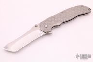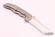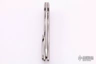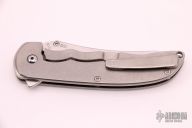This Early Norseman (#202) by John Grimsmo features a polished blade with a single titanium thumb stud, notched thumb ramp and flipper. Stonewashed titanium frame with a honeycomb pattern front scale and titanium screws. Very smooth action that requires no wrist movement. Nice detent, lockup and blade seating. Rides on ceramic bearings. Knife is in excellent condition, shows no signs of use or carry. Comes with original hard case and COA dated 04-05-14.