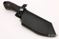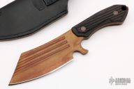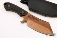 This TAK Kleever by Jason Stout features a bronze coated and satin finished blade with milled fullers, chisel grind, .237" blade stock and 2.275" blade depth, full tang construction with milled black canvas micarta scales. Comes with a black leather sheath and COA dated 10/31/19. Excellent condition.