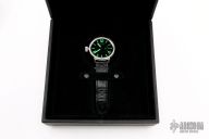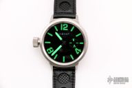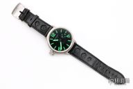 This U-Boat U-6497 features a 50mm stainless steel case, black leather strap, and luminous hands and markers. Comes with original box and instruction manual. Has been worn, has some scratches, otherwise good condition. 17 Jewels, 100mt. water proof, Acciaio 316L, Ventro Zaffrio, Made in Italy.