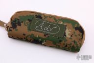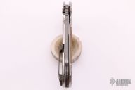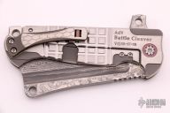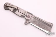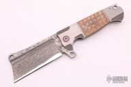 This Battle Cleaver by Andre De Villiers features a VG-10 core San Mai Damascus cleaver style blade with notched thumbrest and flipper, fullers and hole in the blade. The handle has a two-tone titanium frame with milled copper inlays and pivot collars, milled and anodized tip up titanium clip with roller and black coated front, copper inlay in the titanium backspacer, stainless lockface insert with integral overtravel stop. Rides on bearing, nice detent, lockup and blade seating. Comes with zippered case. Excellent condition.