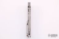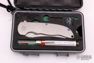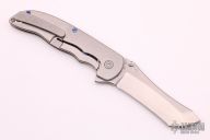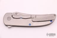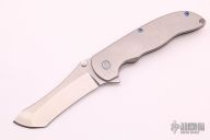 This Norseman (#3140) by John Grimsmo features a tumble finished blade with dual titanium thumbstuds, notched thumbrest and flipper. Tumble finished and crosshatch milled titanium frame with anodized titanium screws. Very smooth action that requires no wrist movement. Nice detent, lockup and blade seating. Rides on ceramic bearings. Knife is in excellent condition, shows no signs of use or carry. Comes with original packaging, custom hard case, Nano-Oil, tool, and COA dated December 11th, 2019.