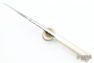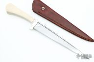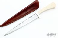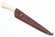 This Pesh Kabz by Paul Cooper features a hand forged hand rub satin finished blade with fileworked spine, .474" blade stock just in front of the guard and the blade has a nice distal taper to the tip, 1.248" blade depth, full tapered tang construction. The handle has a fileworked nickel silver guard that is made of three pieces, Elforyn Super Tusk scales with hand peened nickel silver pins. The handle has a nice swell at the butt. Comes with a brown leather sheath with belt stud. New from maker. Really cool piece! This knife was photographed by "SharpbyCoop". Check it out HERE.