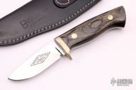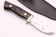 This knife was designed by Buster Warenski and produced by Ensign Knives.  This knife features a mirror polished blade, a nickel silver guard and dyed wood scales over a tapered tang construction.  .168" Blade Stock.  1.075" Blade Depth.   Includes a black leather sheath.  Excellent Condition.