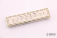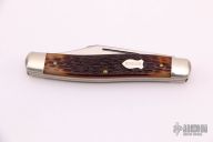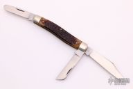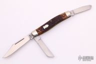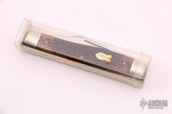 This Model 881 by Schrade Cutlery features a 3 satin finished blades with nail nicks. The handle features pinched nickel silver bolsters, jigged delrin covers, brass liners. Comes with original box and papers. Excellent condition. LNIB