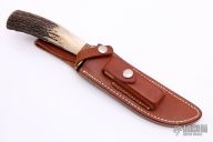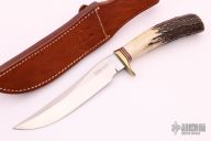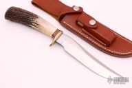 This Model 3-6 by Randall Made Knives features a satin finished blade with false top edge and old logo, .191" blade stock and 1.133" blade depth, hidden tang construction. The handle has a brass guard, stag grip with red/white/blue spacers. Comes with a brown leather sheath and sharpening stone. Excellent condition. Made in the 1970s.