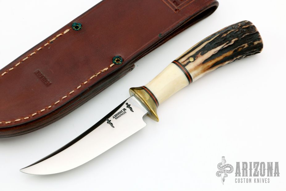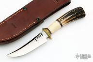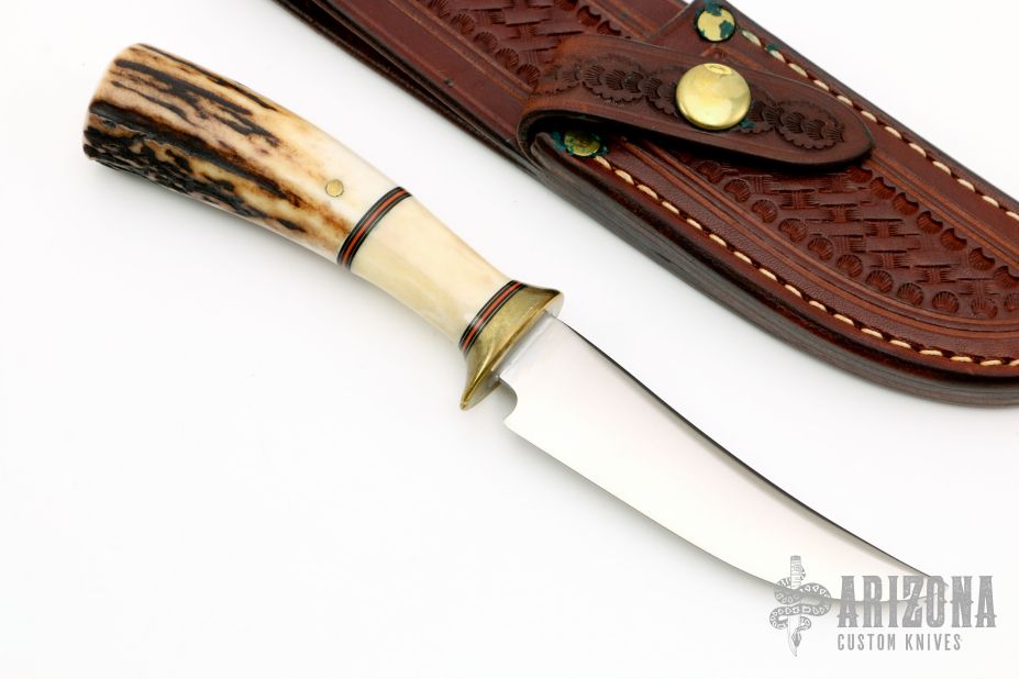This Bird and Trout by James Behring features a satin finished convex blade with .152" blade stock and .955" blade depth, hidden tang construction. The handle has a brass guard, stag grip with a brass pin, spacer pattern consisting of black/brass/red/stag. Comes with a hand tooled brown leather sheath. Excellent condition.
