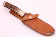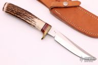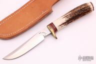 This G1 Hunter by Enedino De Leon features a satin finish blade with a false top edge, .216" blade stock and .909" blade depth, hidden tang construction. The handle has a brass guard, stag grip with black/red spacers, brass butt. Includes a brown leather sheath. Excellent condition.