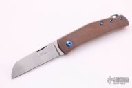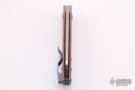 This Monte Carlo by Jens Anso features a hand rub satin finished sheepsfoot style blade with nail nick. The handle has tumbled copper scales over dual inlaid liners with double detent that provides a crisp click in the open, closed and half stop positions. Anodized titanium hardware, backspacer with lanyard bail and machined tip up clip. Includes original box, a leather slip sheath and COA dated June 2021 and s/n 513. New from maker.