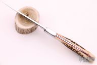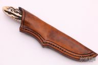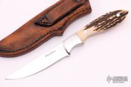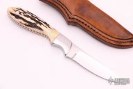 This knife by Jerry Hendrix features a mirror polished blade with .125" blade stock and .737" blade depth, full tapered tang construction. The handle has dovetailed mirror polished bolsters, stag scales with red liners and file work along the full tang. Comes with a brown leather sheath. Excellent condition.