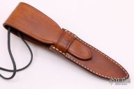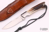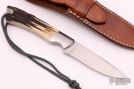 This Hunter by Larry Newton features a hand rub satin finished blade with false top edge and notched thumbrest, .123" blade stock and .968" blade depth, full tapered tang construction. The handle has satin finished stainless steel bolsters and stag scales with a lanyard hole at the butt. Comes with a brown leather sheath. Excellent condition.