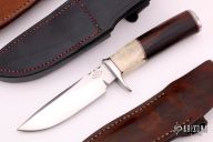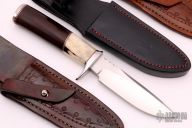 This knife by Jeff Hollett features a hand rub satin finished blade with fileworked spine, .245" blade stock and 1.126" blade depth, hidden tang construction. The handle has a stainless steel guard and butt, stag and cocobolo grip with nickel silver and red spacers. Comes with 2 hand tooled brown leather sheaths and a black leather sheath. Has a couple light scratches, otherwise excellent condition.