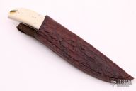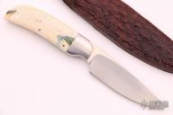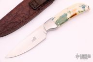 This hunter by Arno Bernard features a hand rubbed satin finish blade with .134" blade stock and 1" blade depth, full tapered tang construction. The handle has stainless steel bolsters with warthog tusk scales. Includes a water buffalo hide brown leather sheath. Excellent condition.