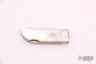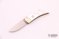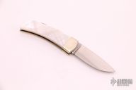 This lockback folder features a mirror polished drop point blade. The handle has nickel silver bolsters, mother-of-pearl scales, brass liners, and a stainless steel backspacer. #849. Excellent condition.