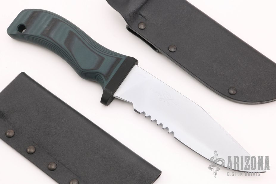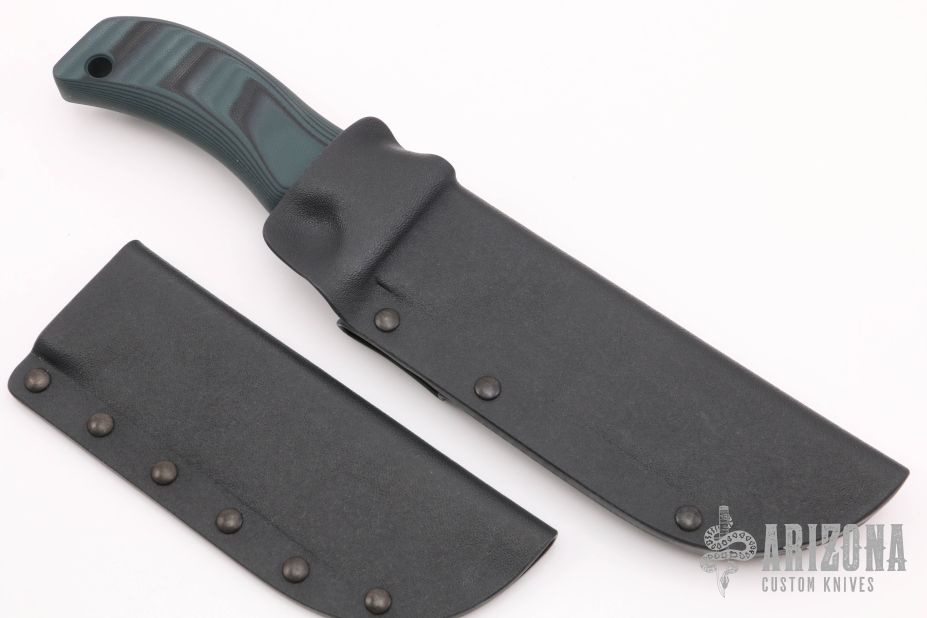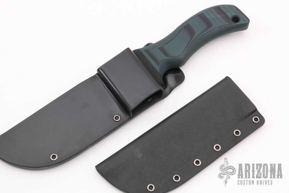 This Centurion by MadDog Knives features a clip point blade with .250" stock. 1.485" blade depth. Selectively tempered, the knife has a Rockwell C-scale hardness of 62 at the edge (as hard as a file), and HRC 50-54 throughout the spine and hidden full tang. Hard chrome blade finish. With "Mad Dog" on the blade. The black/green G-10 handle is designed to be ergonomic and has the ability to withstand tremendous punishment with little or no damage. It is hard and tough enough to be used as an impact tool. Includes a Hi-Ride sheath and Shirasaya. New from maker.