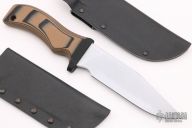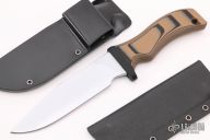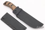 This Centurion by MadDog Knives features a clip point blade with .250" stock. 1.485" blade depth. Selectively tempered, the knife has a Rockwell C-scale hardness of 62 at the edge (as hard as a file), and HRC 50-54 throughout the spine and hidden full tang. Hard chrome blade finish. With "Mad Dog" on the blade. The black/tan G-10 handle is designed to be ergonomic and has the ability to withstand tremendous punishment with little or no damage. It is hard and tough enough to be used as an impact tool. Includes a Hi-Ride sheath and Shirasaya. New from maker.