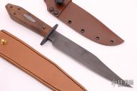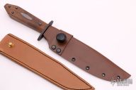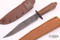 This Midnight Gambler from Greg Covington features a parkerized clip point blade with a sharpened top edge, .244" blade stock and 1.544" blade depth, hidden tang construction. The handle is comprised of a parkerized steel guard with fluted edges, black walnut grip with black steel studs and a bead blasted steel escutcheon. Includes leather sheath with steel belt stud and a kydex sheath with belt stud. Has some light scuffs otherwise excellent condition.