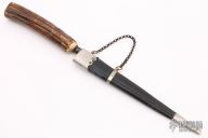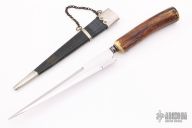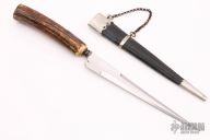 This 19th Century Corsican vendetta features a double edged blade, blade grinds and flats are hollow ground, has an integral fluted guard, .159" blade stock and .791" blade depth, hidden tang construction. The handle has a stag grip with nickel silver butt plate. Comes with original black leather and nickel silver scabbard. Comes with a zippered case. Has a few light pitting marks, otherwise excellent condition for its age.