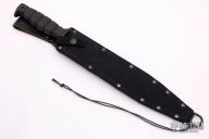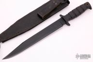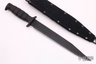 This knife by Ontario features a black blade with sharpened top edge, .201" blade stock and 1.392" blade depth, hidden tang construction. Rubber handle with lanyard hole. Comes with nylon sheath. Has some scuffs and scratches, otherwise good condition.