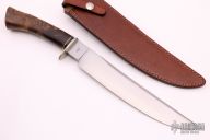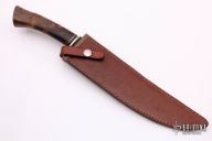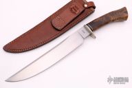 This Arkansas Camp Knife by Master Smith Jerry Fisk features a hand rub satin finished blade with a nearly sharpened top edge, .224" blade stock and 1.525" blade depth, hidden tang construction. The handle has a nickel silver guard and fluted spacer with a burl wood handle. Comes with a brown leather sheath made by Rowe's Leather. Has a couple light scratches, otherwise excellent condition. Comes with a zippered case.