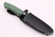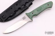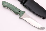This Chute knife by Walter Brend features a mirror polished blade with satin flats, .277" blade stock and 1.168" blade depth, full tang construction. The handle has green canvas micarta scales with hollow pins. Comes with a black leather sheath and zippered case. Excellent condition.