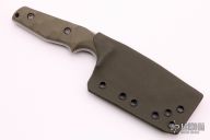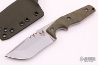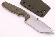 This SKULD by Bawidamann Blades features a stonewashed blade with a false top edge, notched thumbrest and fileworked spine, 5/32" blade stock and 1 1/2" blade depth, full tang construction. The handle has contoured green G-10 scales. Comes with a kydex sheath. Has some sheath scratches, otherwise excellent condition.