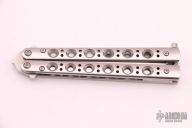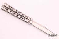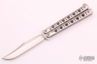 This Model 63 Balisong by Benchmade features a clip point blade with swedge. The handle is comprised of skeletonized stainless steel construction over steel spacers, t-latch. Has a couple light scratches, otherwise excellent condition. Comes with original box, sheath and papers.