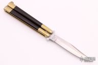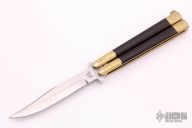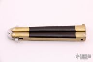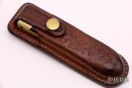 This Balisong features a satin finished blade ground by Jody Samson. The handle is comprised of integral dovetailed brass handles with red canvas micarta inlays. Brass T latch on pommel. Some dings on the brass and some light scratches throughout, the knife is in good condition otherwise. Comes with original brown leather sheath.