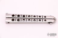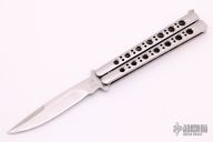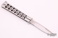 The model 45 by Benchmade features a spear point blade with false top edge. Stainless steel skeletonized handles with T latch. Has some scratches, has been resharpened, fair condition.