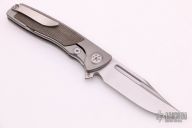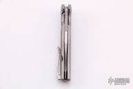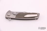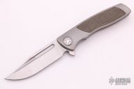 This Micro Evo from Brian Nadeau features a satin finished BOWIE blade with a fuller and notched thumbrest. The handle has a bead blasted titanium frame with green canvas micarta inlays, satin titanium tip up clip. Rides on bearings, nice detent, lockup and blade seating, stainless lockface insert. Includes original box. New from maker.