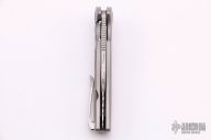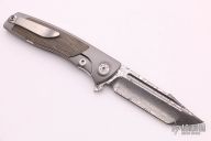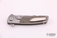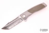 This Micro Evo from Brian Nadeau features a Damasteel Harpoon blade with a fuller and notched thumbrest. The handle has a bead blasted titanium frame with green canvas micarta inlays, satin titanium tip up clip. Rides on bearings, nice detent, lockup and blade seating, stainless lockface insert. Includes original box. New from maker.