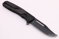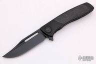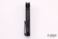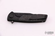 This Micro Evo from Brian Nadeau features a black Bowie blade with a fuller and notched thumbrest. The handle has a black PVD titanium frame with marble carbon fiber inlays, black titanium tip up clip. Rides on bearings, nice detent, lockup and blade seating, stainless lockface insert. Includes original box. New from maker.