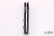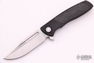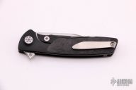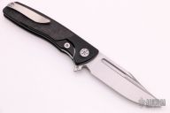 This Micro Evo from Brian Nadeau features a satin finished Bowie blade with a fuller and notched thumbrest. The handle has a black PVD titanium frame with marble carbon fiber inlays, satin titanium tip up clip. Rides on bearings, nice detent, lockup and blade seating, stainless lockface insert. Includes original box. New from maker.