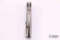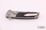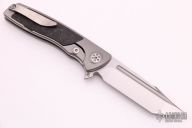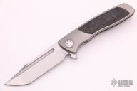 This Micro Evo from Brian Nadeau features a satin finished Harpoon blade with a fuller and notched thumbrest. The handle has a bead blasted titanium frame with marble carbon fiber inlays, satin titanium tip up clip. Rides on bearings, nice detent, lockup and blade seating, stainless lockface insert. Includes original box. New from maker.