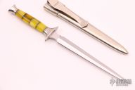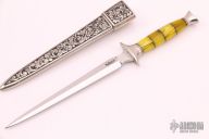 This Dagger by Devon Butch Beaver features mirror polished double-edged blade with .129" blade stock and .498" blade depth, hidden tang construction. The handle has a nickel silver guard and butt, stacked amber grip. Comes with a nickel silver scabbard with clip. The butt of the knife and the scabbard have been engraved by Bruce Shaw. Comes with a zippered case. Excellent condition.