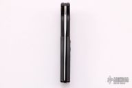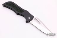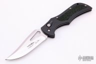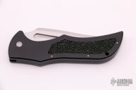 This auto by Gil Hibben features a mirror polished clip point blade. The handle has a black aluminum frame with black rayskin inlays and a lanyard hole at the butt. Nice lockup, action and blade seating. Excellent condition. This knife is one of only 10 ever made. Comes with a zippered case.