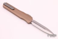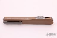 This Cypher OTF is a collaboration between Anthony Marfione and DC Monroe. It features a stonewash double-edged blade with standard edges. The handle has a tan aluminum handle with bead blasted hardware, and a titanium tip down clip and a titanium insert at the butt. Comes with original box and papers. Excellent condition.  S/N 1853.  Dated 04/2018.