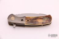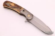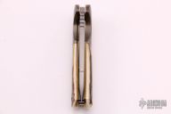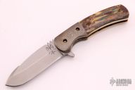 This Designated Marksman Linerlock flipper by Doc Shiffer features a tumbled blade with a flipper and notched thumbrest. The handle has Chad Nichols Damascus Bolsters, mammoth ivory scales, anodized titanium liners. Nice blade seating, detent and lockup, rides on bearings. Comes with original box and COA. New from maker.
