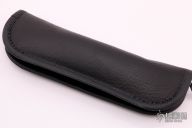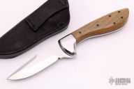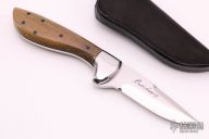 This piece by Gaetan Beauchamp features a hand rub satin finished blade with false top edge, .126" blade stock and .975" blade depth, full tang construction. The handle has dovetailed mirror polished stainless bolsters and bone scales with black liners. Nicely contoured handle. Comes with a zippered case and black leather sheath. Has a couple light scratches, otherwise excellent condition.