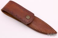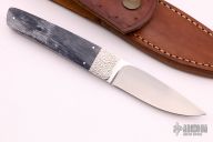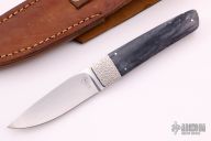 This BM2 Utility by Andre Thorburn was made in 2000. It features a hand rub satin finished blade with .121" blade stock and .847" blade depth, full tang construction. The handle has a textured and dovetailed stainless steel bolsters and charcoal Giraffe Bone scales with red liners. Comes with a hand tooled brown leather sheath and COA.