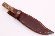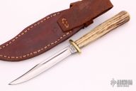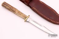 This Slim Hunter by Clancy Riggs features a satin finished blade with false top edge and fullers, .186" blade stock and .660" blade depth, hidden tang construction. The handle has a brass guard with stag grip. Comes with a brown leather sheath made by Mike Bartol of Colorodo. Has some light scratches, otherwise excellent condition.
