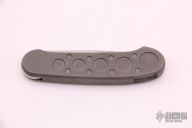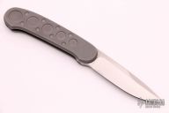 Barry Wood design for Pacific Cutlery. This is a very unique scissor opening folder, which when the blade is fully open and locked in place is almost a fixed blade knife. Opening is accomplished by lighting pressing down and outward at the rear indentation on the spine, which releases the locking pin and allows one side of the handle and the blade to rotate down then forward until the blade locks in the forward position. The one side of the handle continues to rotate back until it locks in place. Closing requires the same slight thumb pressure at the indentation to release the locking pin, then the one side of the handle is rotated back and around, catching the blade and aligning both with the other side of the handle in a locked closed position. Stonewashed blade with bead blasted stainless steel scales. Has a couple light scratches, otherwise excellent condition. Comes with a zippered case.