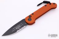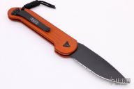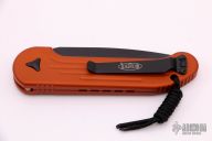 This LUDT side opening automatic from Microtech has a black finish blade with a partially serrated edge and a contoured orange aluminum frame. Stainless steel clip. Dated 05/2021 and serial number 24437, comes with original box and papers. Excellent condition.