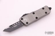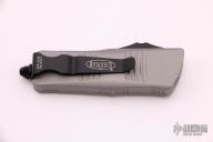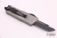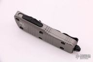 This Troodon Mini OTF automatic by Microtech knives features a black finished tanto blade with satin finished flats and a gray aluminum handle with black hardware, tip down carry. Glass breaker. S/N 2319. Dated 06/2021. Comes with original box and papers. Excellent condition.