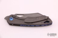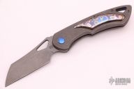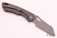This Whippersnapper from Olamic Cutlery features a stonewash finished blade, thumbhole, notched thumbrest and front flipper. The titanium frame has a Fedokume inlay, pocket clip is positioned for tip up carry, floating, anodized and sculpted titanium backspacer. Blade is centered when closed and locks up with no play. Comes with maker's card with a serial number of WS514-W and dated 05/05/2021. Includes a padded zippered case. Excellent Condition.