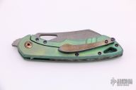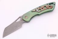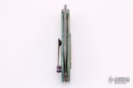 This Whippersnapper from Olamic Cutlery features a stonewash finished blade, thumbhole, notched thumbrest and front flipper. The titanium frame has an "Antique Eutropid" titanium inlay, pocket clip is positioned for tip up carry, floating, anodized and sculpted titanium backspacer. Blade is centered when closed and locks up with no play. Comes with maker's card with a serial number of WS535-W and dated 05/14/2021. Includes a padded zippered case. Excellent Condition.