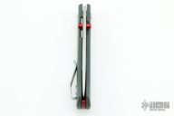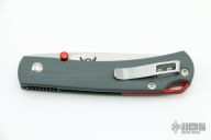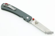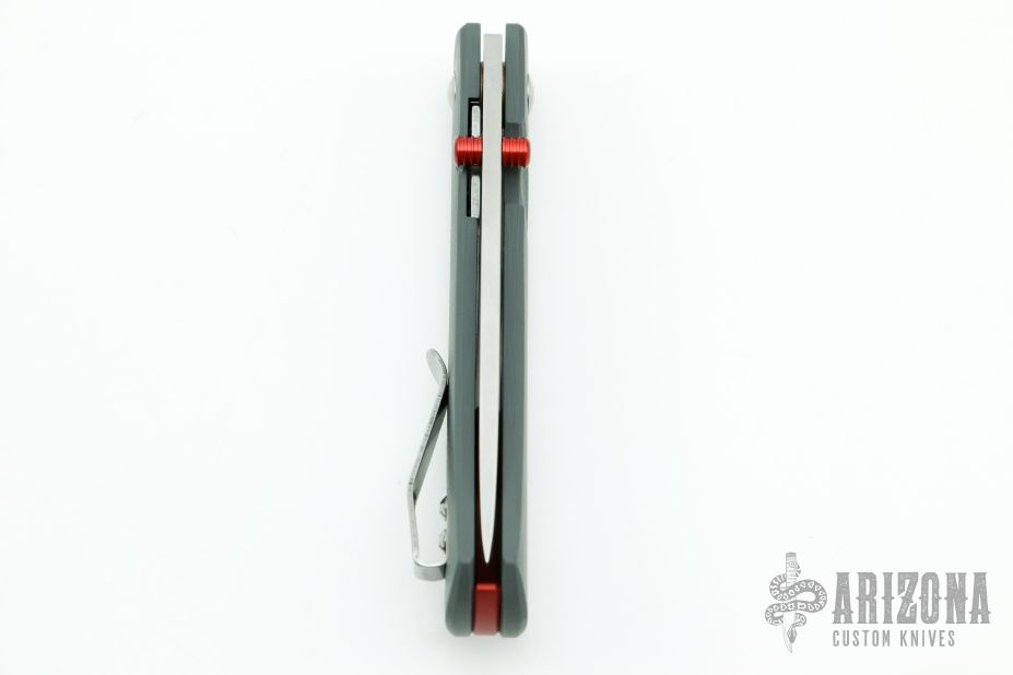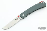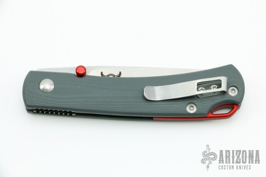 This OX by Smith and Sons features a stonewashed blade with dual thumbstuds. The handle has grey G-10 scales, red aluminum backspacer, stainless steel liner and tip up clip. Comes with original box and papers. Excellent condition.