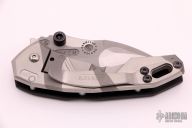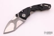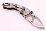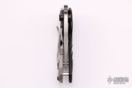 This Monitor framelock folder by Duane Carrillo features a two-tone tanto recurve blade with false top edge and dual thumbstuds. The handle has a black G-10 front scale and a two-tone titanium frame and tip up clip, has standoffs. Nice detent, lockup and blade seating. Comes with a pelican case. Has a few scratches, otherwise excellent condition.