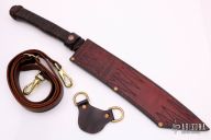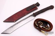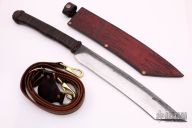 This Tanto Short Sword by Rick Marchand features a hand forged blade with false top edge, .253" blade stock and 2.089" blade depth, hidden tang construction. The handle has a hemp cord wrapped handle. Comes with a custom brown leather sheath with shoulder rig. Excellent condition.